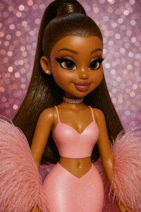 Elegant barbie-style doll shines beautifully in sparkling pink fashion.