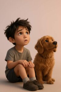 Sweet little boy sits beside his loyal adorable puppy friend. #CuteBond