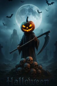 Pumpkin-headed reaper stands fearlessly under moonlit sky surrounded by bats.