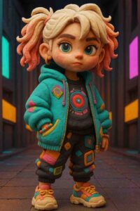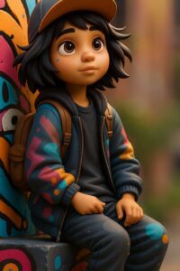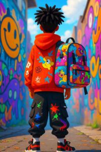 Vibrant street art kid exploring alley full of bright graffiti.#StreetVibes