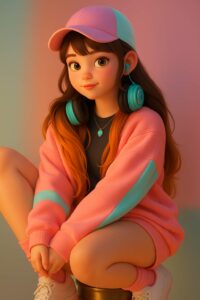 Cute pastel gamer girl relaxes wearing headphones and comfy outfit.