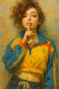 Artistic girl gestures silence with expressive eyes and painted texture.