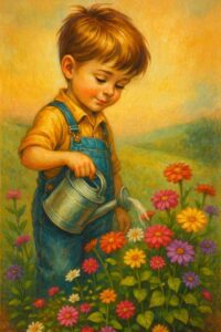 Smiling little boy waters colorful blooming flowers in warm sunlight.