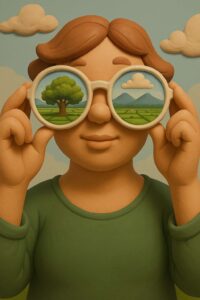 Boy sees peaceful landscapes reflected beautifully through oversized round glasses.