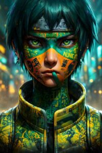 Cyber warrior girl with glowing tattoos stands fearlessly in neon.