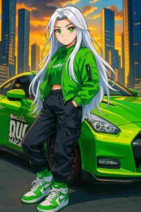 Confident anime girl stands boldly beside her stylish green car.#StreetRacer