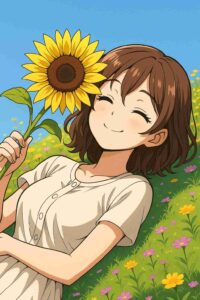 Smiling girl relaxes on meadow holding bright blooming sunflower gently.