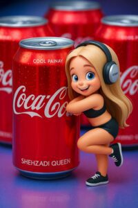 Adorable doll girl poses excitedly hugging giant red cola can.#CuteEnergy