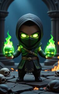 3d cartoon wallpaper hd 1080p download: Mystic ninja unleashes glowing green skull magic in darkness.