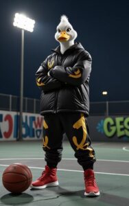 Cool blue-haired boy wearing trendy streetwear and oversized goggles.