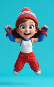 Happy energetic girl jumps joyfully with bright colorful winter outfit.