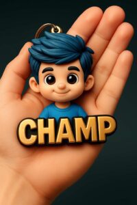 Cute blue-haired champ keychain resting softly on someone’s palm.