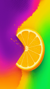 Bright orange slice bursting on neon rainbow background. #JuiceSplash