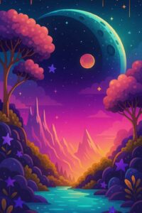 Surreal cosmic landscape with sunset skies and towering mountains of wonder.#CosmicDreams