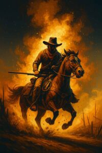 Fearless cowboy riding through dramatic flames, burning ground and chaos.