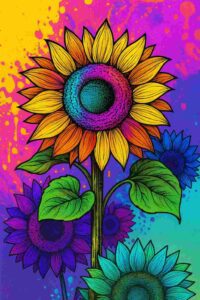 Vibrant psychedelic sunflower blooming with rainbow colors on splattered abstract background.#ColorBloomArt