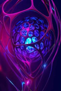 Sci-fi glowing energy core wrapped inside metallic neon organic structure.
