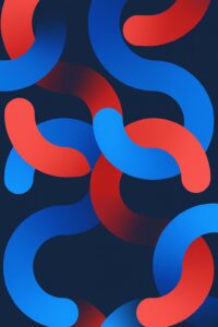Minimal interlocking red and blue shapes arranged playfully on dark background.