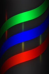 Smooth glowing RGB color waves floating over dark background with soft reflections.