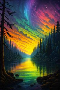 Magical rainbow aurora sky reflecting beautifully on calm lake between forest.