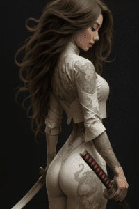 Elegant warrior woman with tattoos and sword, fearless stance.