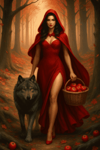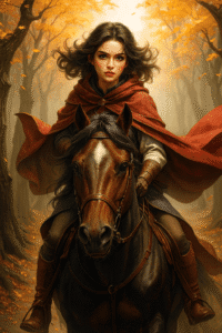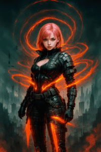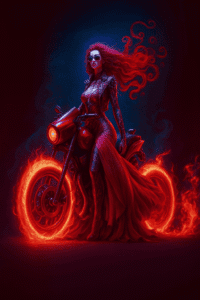 Fiery red-haired woman riding burning motorcycle, fearless dark queen.