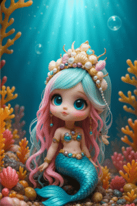 Adorable little mermaid princess with crown, sparkling underwater world.