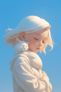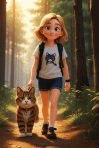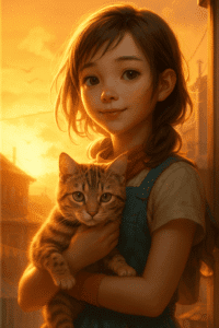Smiling girl holding cat, golden sunset warmth surrounds them.
