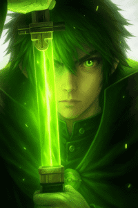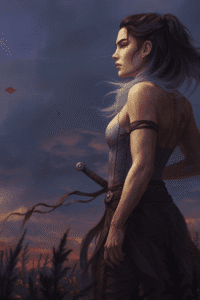 Strong warrior gazing horizon, sword ready, determination shines bright.