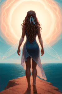 Fairy girl facing glowing portal near ocean, magical fantasy scene.