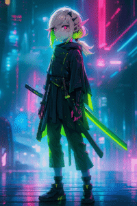 Cyberpunk elf warrior with glowing swords in neon futuristic city.