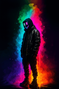 Mysterious hooded figure glowing neon mask with colorful smoke.