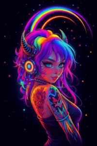 Colorful neon demon girl with tattoos, horns and glowing vibes.