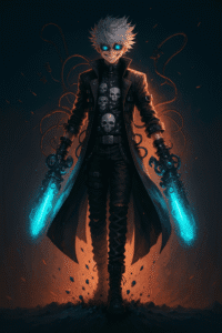 Dark villain warrior holding glowing blue guns, evil powerful aura.