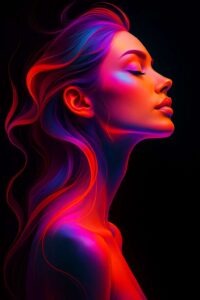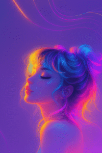 Dreamy neon girl with glowing hair, peaceful and elegant.