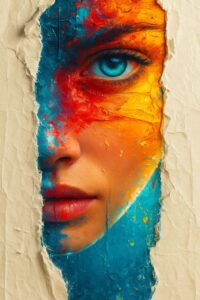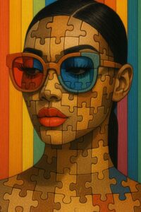 Puzzle-faced woman with rainbow glasses, surreal artistic portrait.
