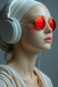 Stylish girl in red glasses with headphones, futuristic fashion vibe.