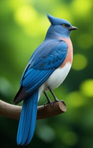 Calm blue tones with elegant crest—graceful beauty in forest silence.