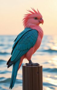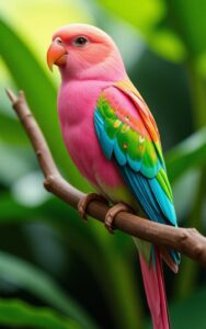 Vivid pink plumage and rainbow wings define joyful tropical beauty.