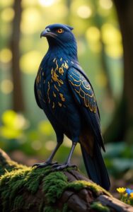 Dark sapphire feathers shine with golden streaks of majestic power.