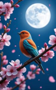 Orange-blue elegance perched beneath cherry blooms and glowing moonlight.