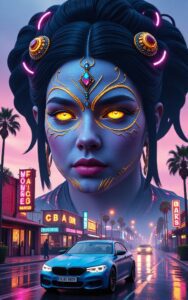 Mythical neon goddess watches city streets glowing beneath twilight skies.