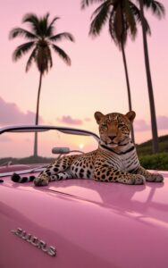 Relaxed leopard lounges royally over pink convertible at sunset.#WildLuxury