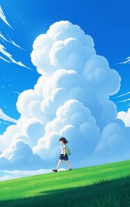 Young girl walks peacefully as towering clouds paint dreamy skies.