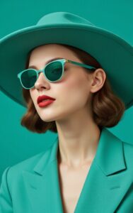Confident woman poses elegantly wearing matching green hat and sunglasses.