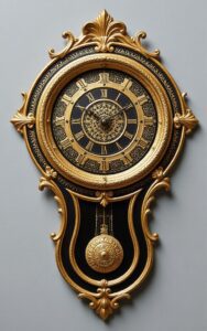 digital art wallpaper: Elegant antique wall clock decorated with intricate golden patterns and pendulum.