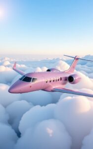 Luxurious pink jet glides smoothly above dreamy cotton clouds.