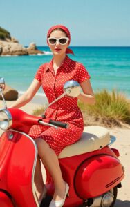 Stylish retro woman rides classic red scooter by the beach.