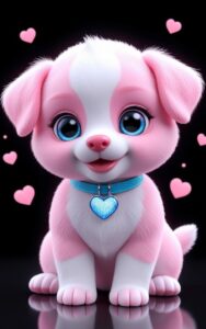 Adorable pink puppy smiling sweetly surrounded by floating heart shapes.#PuppyLove