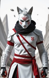 Fierce fox-masked warrior stands powerful amidst swirling mystic winds.
